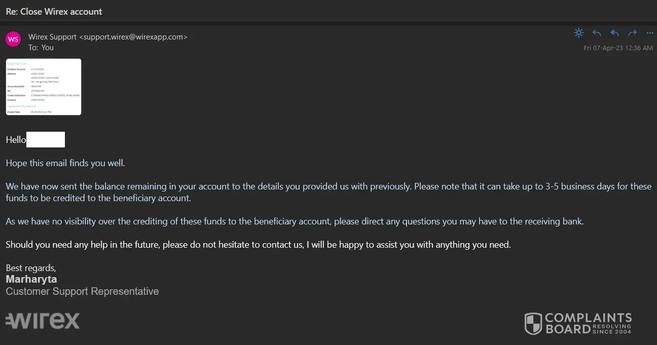 The Wirex Review Team forced me to close my Wirex account and assured me that they would return all remaining funds to my bank account.