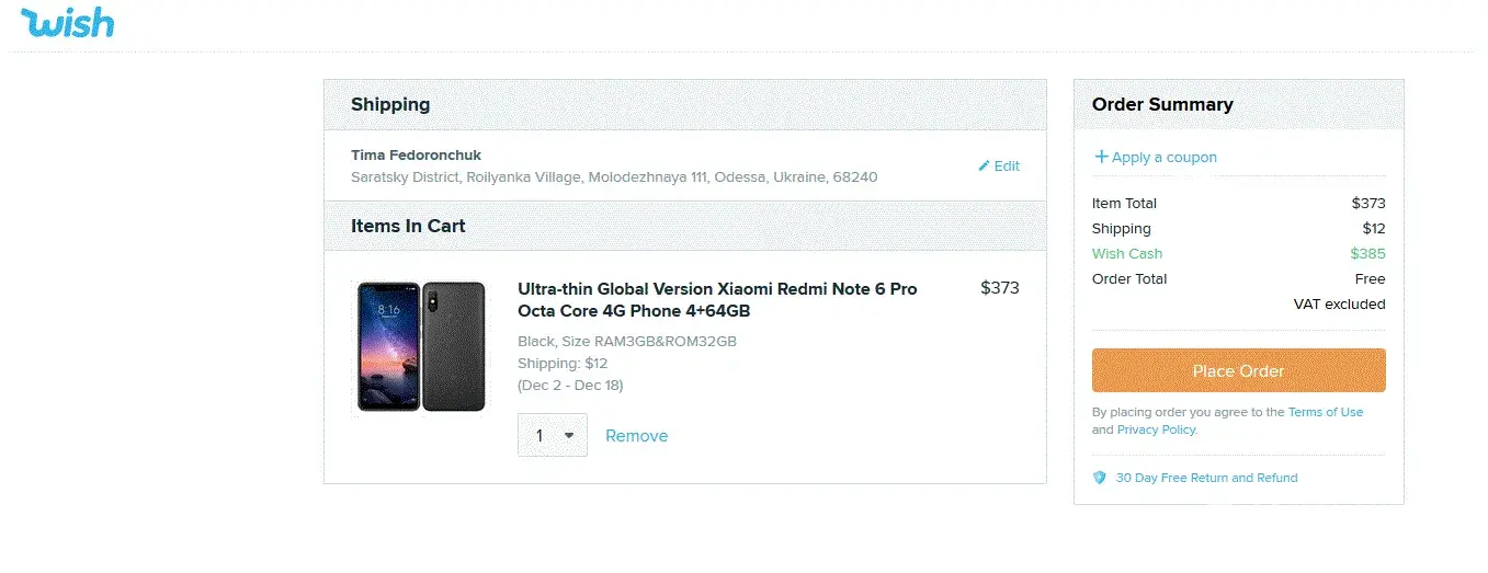 A order for 385.00 was place on my account 11/05/2018. this was an unauthorized purchased. I want my money returned immediately to my checking account. The bank has been notified about this thief. I will no longer buy from Wish and I will make sure non of my friends or co-worked purchase anything else from you because you do not have a way to talk to a human. (poor customer service.) This is my second email did not get a response from the first one 72 hours in response is unacceptable when you have someone stealing money out of your account. will be calling the BBB.