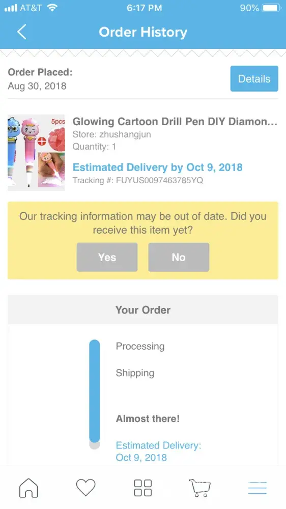Order placed 31 july 2018 - last update 07 aug 2018 - arriving by 30 sep 2018 - tracking # ub254844765up (not received yet)