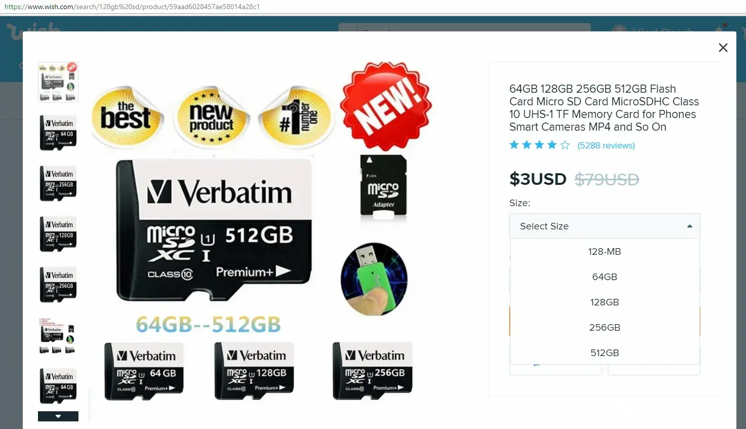 Just stay away from these small crooks with their "wish" site. Check for ex. how they list 128mb option for item titled 64GB 128GB 256GB 512GB Flash Card Micro SD Card.