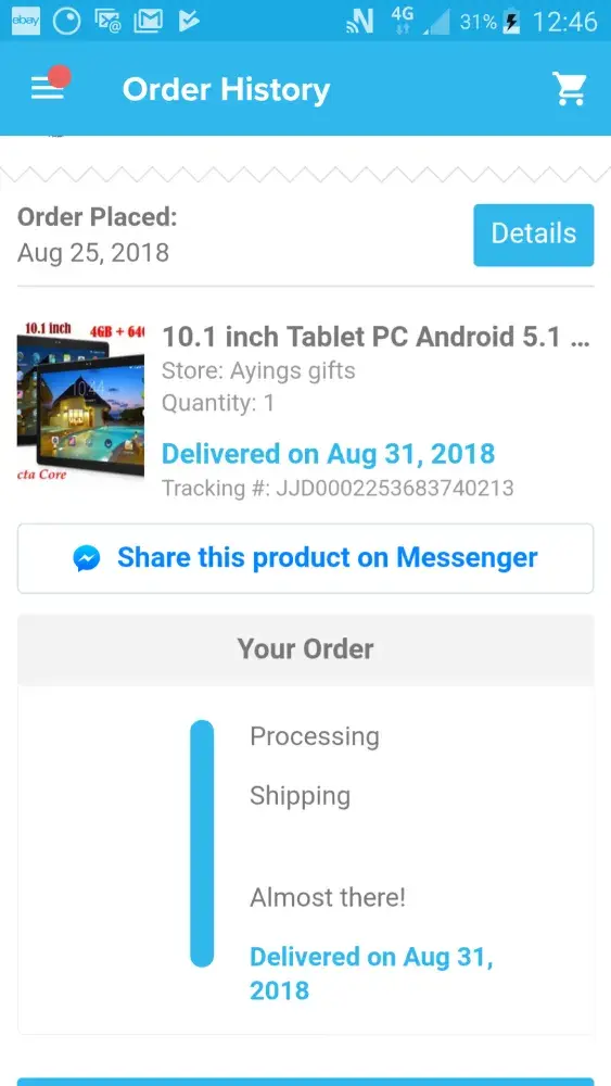 I ordered a 10" Tablet ( screenshot attached) I had a text message to say the item had been delivered but I received no emails from Wish or the couriers Yodel that my parcel was in its way.