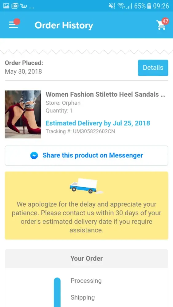 I hav order a clearing mop wit is not deliver to me till now... and aft 3 sept der is no update on the app about my parcel ... der is no C.O.D on app so I paid money online...one more order has place on my behalf... and decuted from my card by there own... wit out my permission... so I cancel ...still der is no refund of my money... from der wish app.
