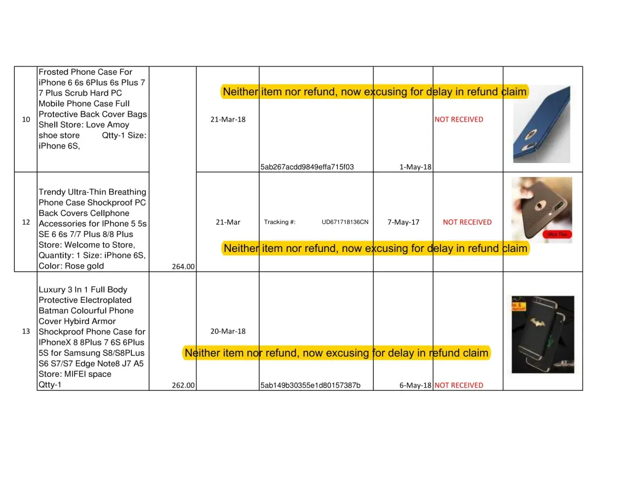 4. the attached list have updated information in highlighted text and Item endorsed at # 1, 2, 3, 10, 12 &13 are not received and even wish.com not refunding my amount too. The whole amount is figuring out as INR 1313.00 (US$~19.00)
