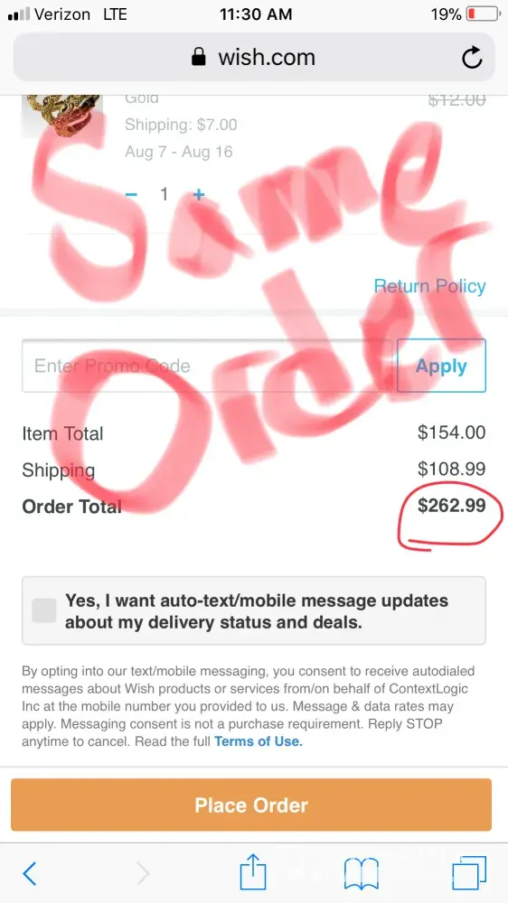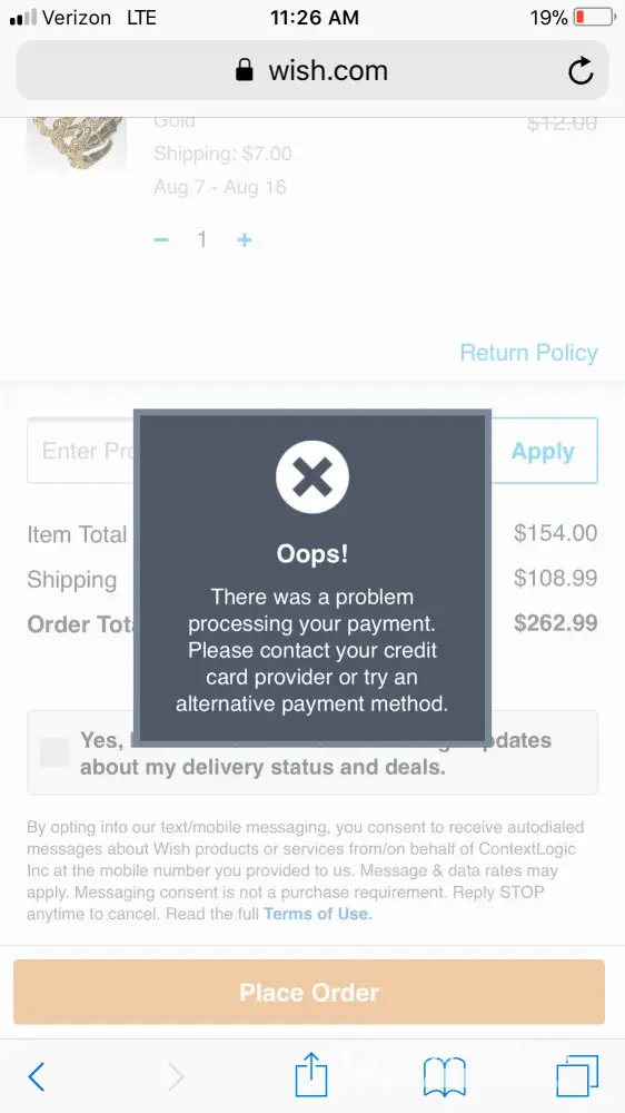 192.00$ 6 items it said they sent it. Well I get on to check and it wants me to repay for it all! Now wish said they misplaced my 70$ phone abd 20$ watch! And said they would sebd to my right address well it. Wants me to buy it again! My name is Breanna Witcher 225 e poplar st 42164 Scottsville ky im not re buying it i lost over 192 $ plus my other 80 to this site i would appreciate it if yall sent me my stuff u can go on my account and see my cart items... Those are the ones it wants me to re buy. The items I bought and they want me to re buy are in the screen shot if this problem is not fixed... Well I just want my stuff i paid for