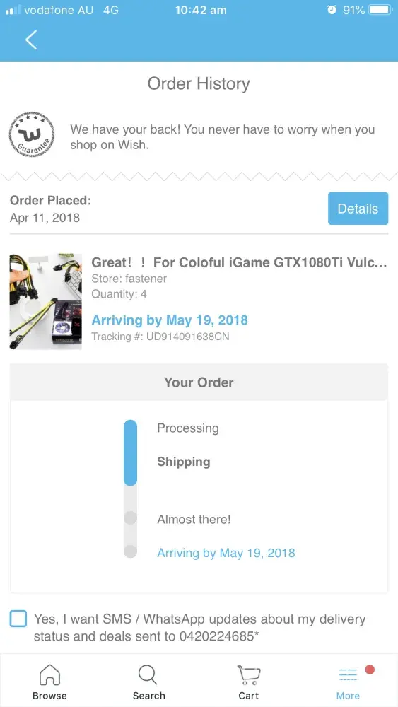 Hi on the 15 March 2019 I ordered 4 items and paid I received a what's up message with link to trace the link did not work and don't have any order on the app I paid through PayPal can I get the goods or my money?