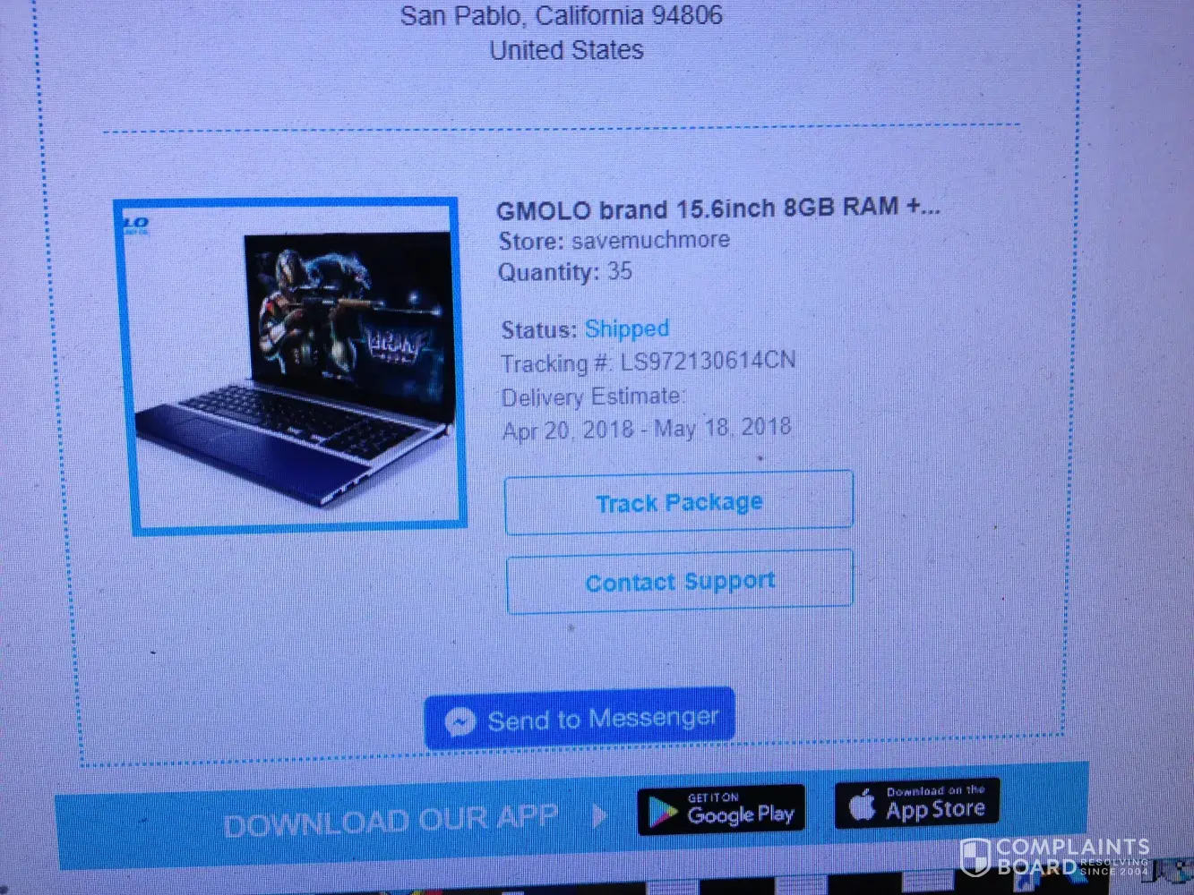 People, WISH has become a scam. Maybe not on all products. But they are scamming on allot of them. You order a certain item, you receive a confirmation email from them. Then when you track it, you will find that it is a different item that is being sent to you. For example, I ordered 35 free gmolo brand laptops and paid $72.00 for shipping. They sent me a verification email showing it was the gmolo laptops that I ordered. Then when I tracked it, now shows that the order was for 35 zeus laptop keyboard dust covers. You can see the pictures both show the same tracking number but the item was changed. I would like to recieve what wish.com offered. Free gmolo brand laptop free just pay for shipping. I paid dhipping for the delivery of 35 free gmolo brand laptops. Or a refund.