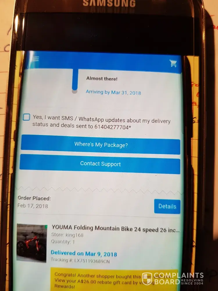 Has been order a Youma folding mountain bike from wish on 17 of February 2018 and on order history show 9th of march is delivery date, but that date instead of sending a bike, the seller sending me a small parcel with a scarfs on it and a letter, in a letter just a excuse for delay to sending a bike, but the painful things is the seller use same tracking number of the bike he use that for a parcel, that mean, I do got a parcel with a tracking number of the bike, but not the bike, , the wish company still sending me a final note for the bike items, but the whole story is nobody want to know? The wish company already answer, the items already out of tracking date (30 days ). In this situation I really do not know what to do, wish already turn there back on me, so please help, all I want is my money refund