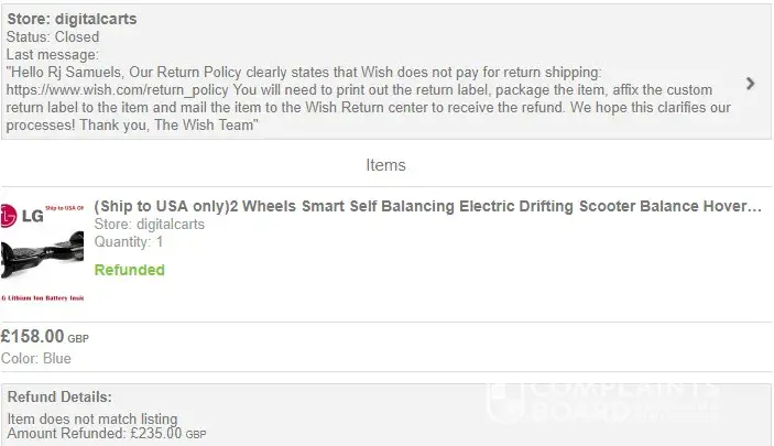 On querying this, Wish said that it clearly states in their return policy, that any returns items should be returned by their method. This has made me angry because now they refuse to pay me what I spent to return the item. The cost of returning the item is almost the same as the item cost. I have included the invoice from DHL and relevant screenshots from my Geek. Wish account.