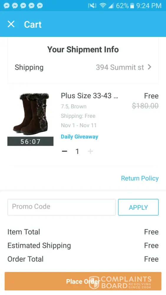 I did the giveaway with boots and I come have screen shots to prove it and I cant place the free order to ship due to an invalid giveaway. Its very upsetting. I feel like this is a false advertisement. I haven't had any complaints and I really enjoy the app and shopping on wish but of your going to advertise make sure the company goes through with it.