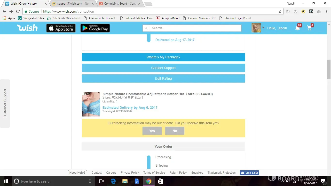 i placed an order with wish on June 30 2017 and it was suppose to be delivered Aug 5 at the latest i received one product early. after that i was expecting my next 2 product to come within a few day. i still haven't received them and have put in many complaints. my order number is 5956c57576460a2e4e2e5fd9 and that is for
