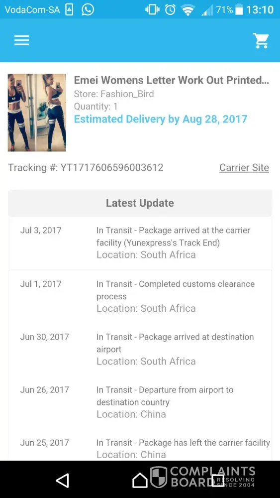 The the tracking on my product says that it is at the carrier facility in south Africa. Yet it has still not arrived.