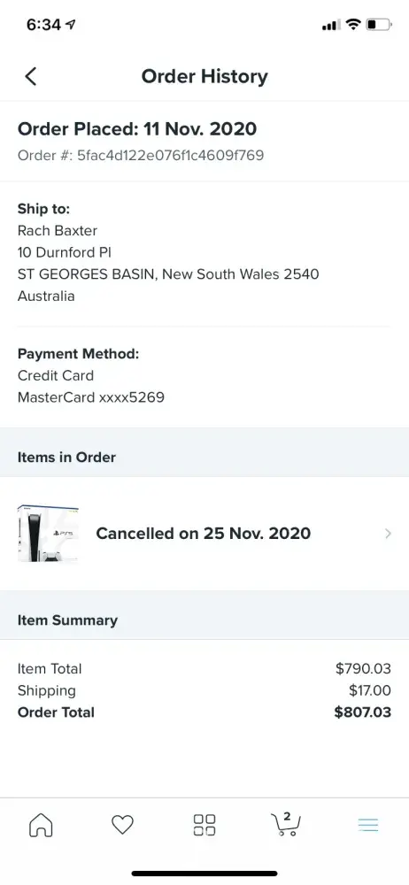 Order a ps5 on 11 nov for $807.03, including postage.