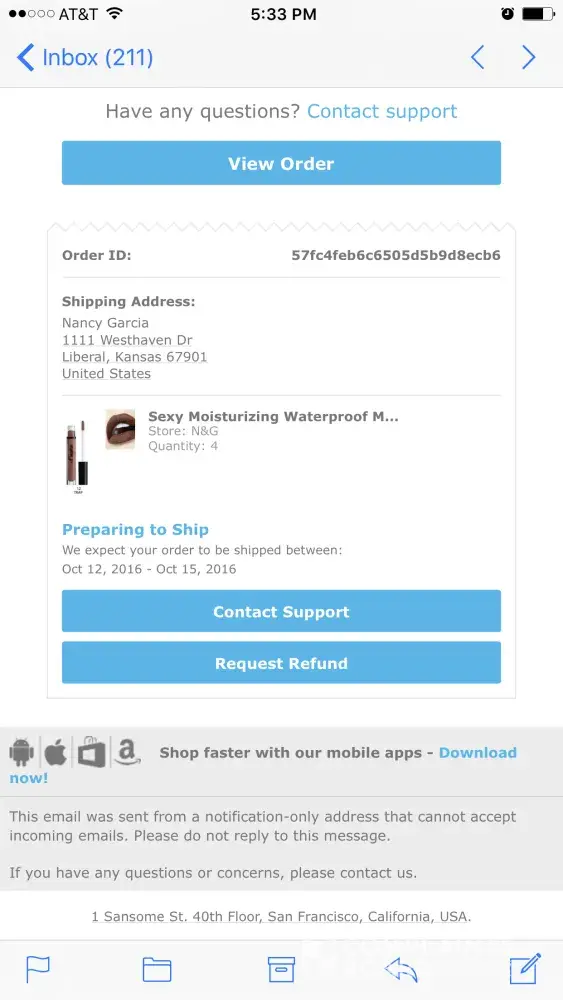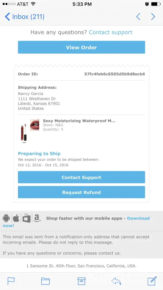This is crazy. I'm so sick of scams and ordering off the internet, bc of places like this. If someone orders and pays for their items - how hard is it to ship them!? And no responses make it worse. The world doesn't even have the decency to make money legally anymore or give someone a heads up on paying for nothing! During christmas too. Smh. When ppl are their brokest. Thanks wish.com. U lost what could've been, a good customer.