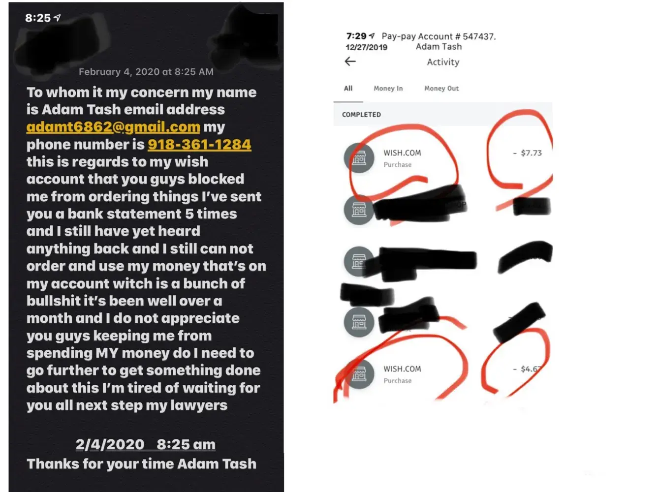 well let's see I have money in my wish account that I added at the store then when I try Tobias it it ask for bank statement and a purchase well most purchase on made by prepaid cards so it's safer then giving your bank information so I found where I purchased from my PayPal account and sent it to them over and over again like 5 or 6 times I sent them documents proving it still here it is 2!weeks later and still nothing it's starting to a bunch of bs eather give me my money back or let me order thanks for your time Adam Tash, [protected]@gmail.com, [protected]