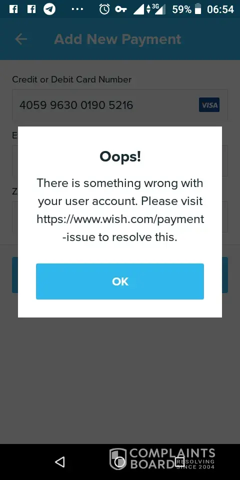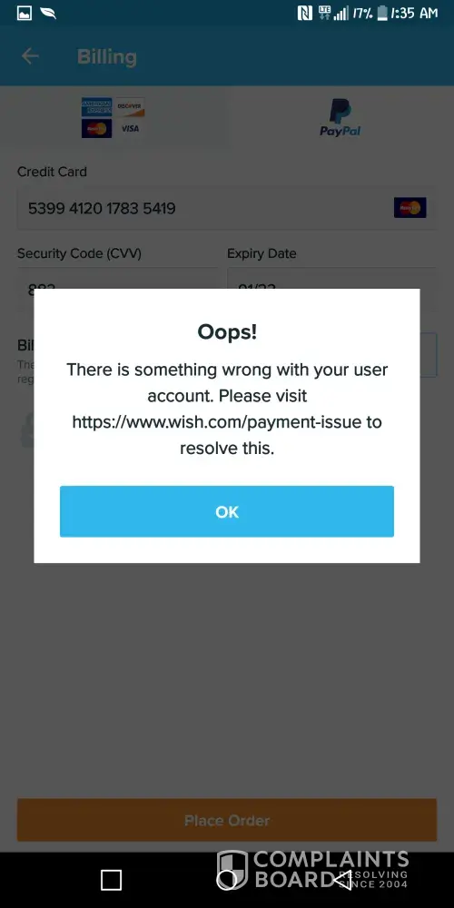 Tells me every time no matter what card that there is a payment issue go to www.wish.com/resolve payment issue. I tryed everything even signing in with Facebook. Also have not received some orders robot vaccume say they delivered it only my post office says can't track somthing that's not in the USA system. Ordered another one waiting till Feb 22 t