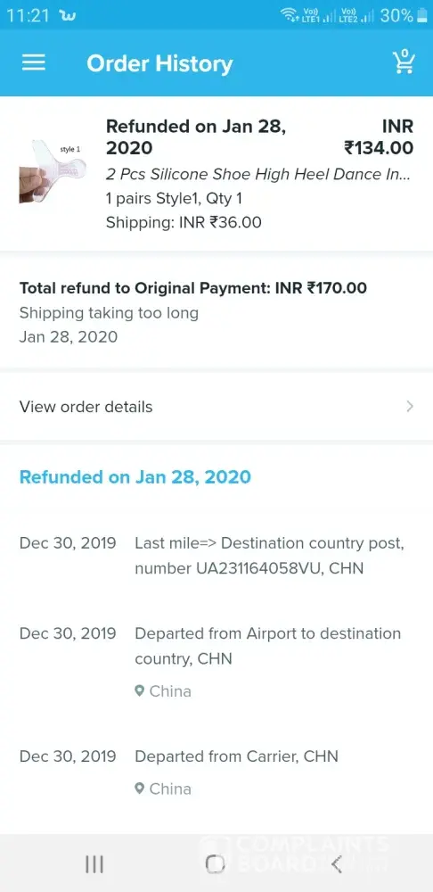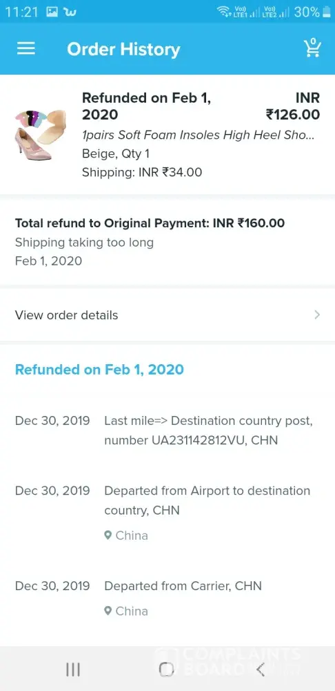 I ordered two different type of insole of rupees 260 and rupees 70 for shipping I didn't get my product on time so I cancelled the order. Wish said they refund my product between 14 bussiness day, now its more than 18 days I didn't recieve my refund, and they also not answer me whem they will give my refund. I want to complain against wish shopping app