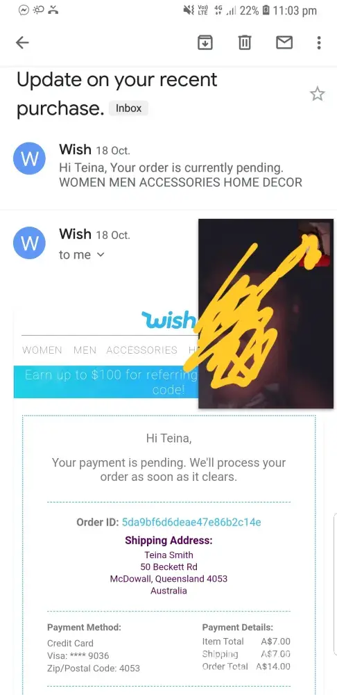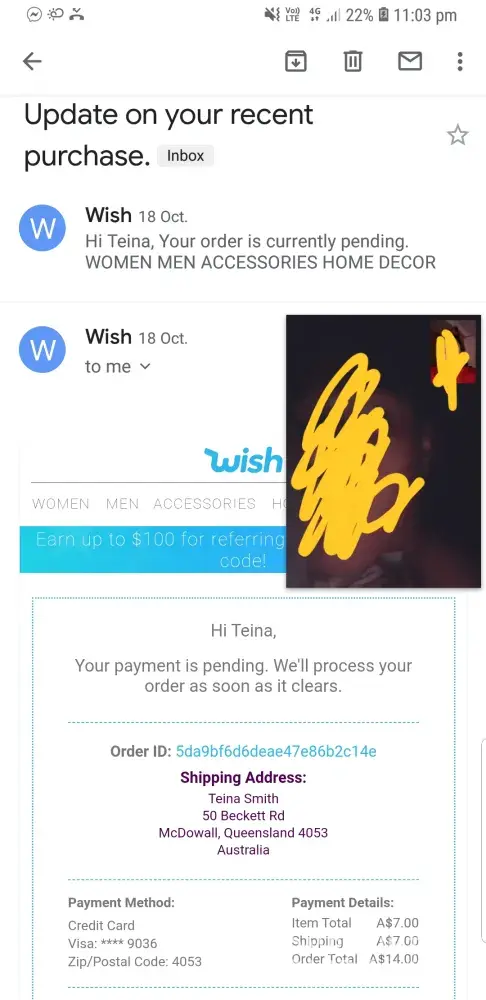 Now the notification screen at Wish says there was an issue processing the payment. When I tap the notification, as advised, I am told that Wish needs a few pieces of information so that they can verify my account and ask for my mail id. When I furnish my mail id it needs a photo id.