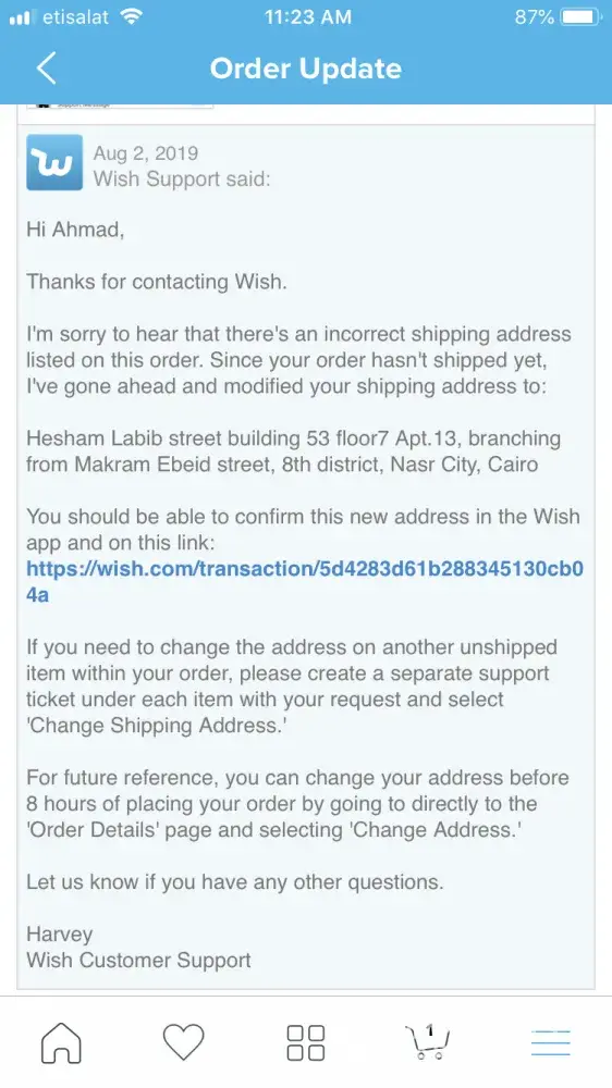 One of your employees called Harvey replied that he changed my shipping address of one of my items as requested, however after rechecking my address is still the same on this order! So I replied please confirm that you changed the shipping address because it shows faulty address in order details, I even attached a photo showing a screenshot with that, carelessly he just copy pasted his reply as if am speaking to a robot! Which I wouldn't mind if my problem got solved. However after double checking faulty shipping address is still present 👎🏻