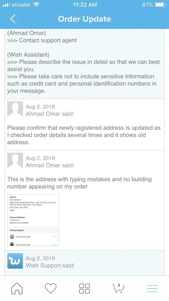 ordered several items from wish however, when checking out My shipping address included typing mistakes and I forgot to mention building number! So I contacted customer support for help regarding some of the items and regarding the rest I couldn't even go through to reach your customer support employees due to stupid autonomous menu !
