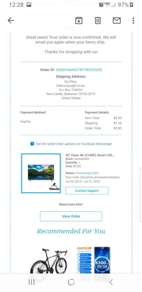 I ordered this tv through the wish app, and hot a confirmed order, but noticed a wrong name and address it was going to be shipped to. I corrected address through app and it said it was updated. I then got a verify acct notice on app. Tried to verify acct and they then refunded my money. The App kept saying to verify acct, and I did. Even after the refund it says to verify acct. I want my TV that I ordered!I suppose I could bring a lawsuit against them.