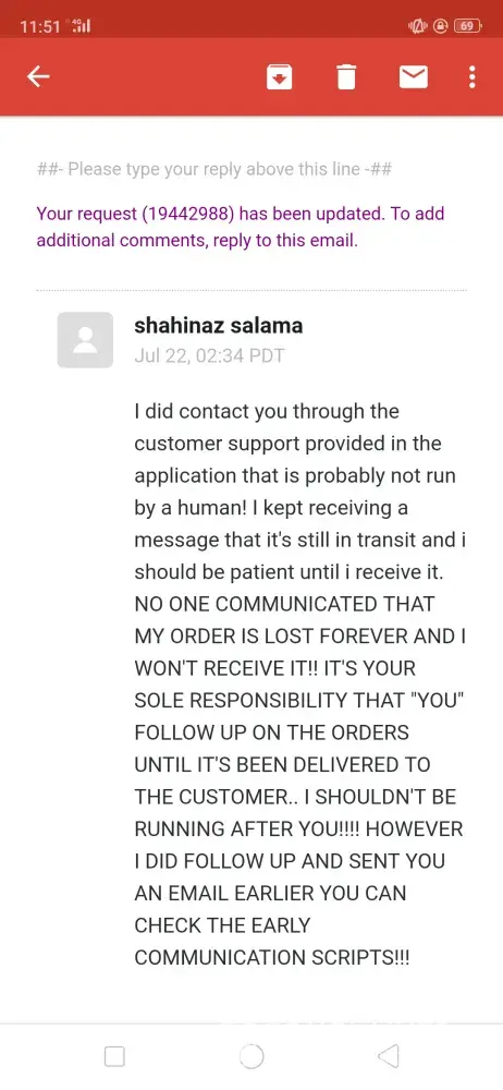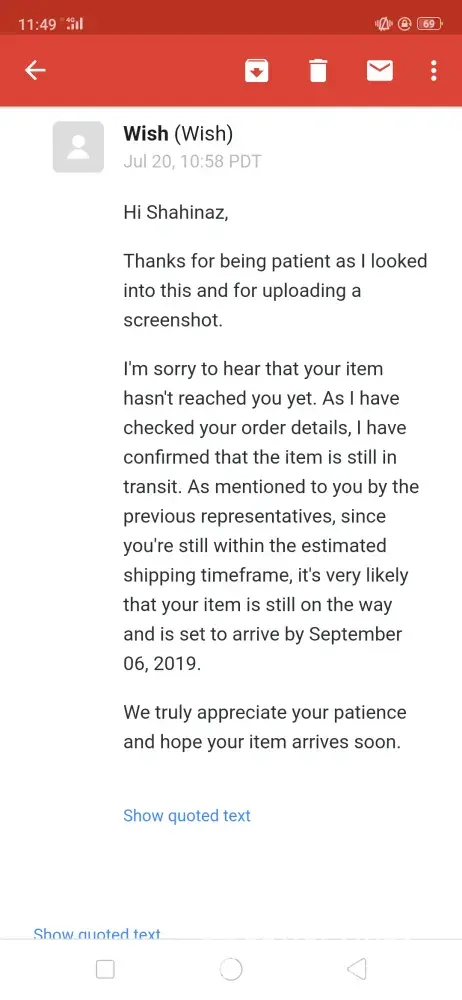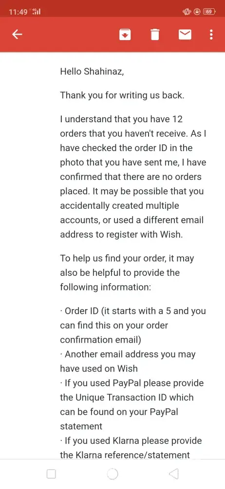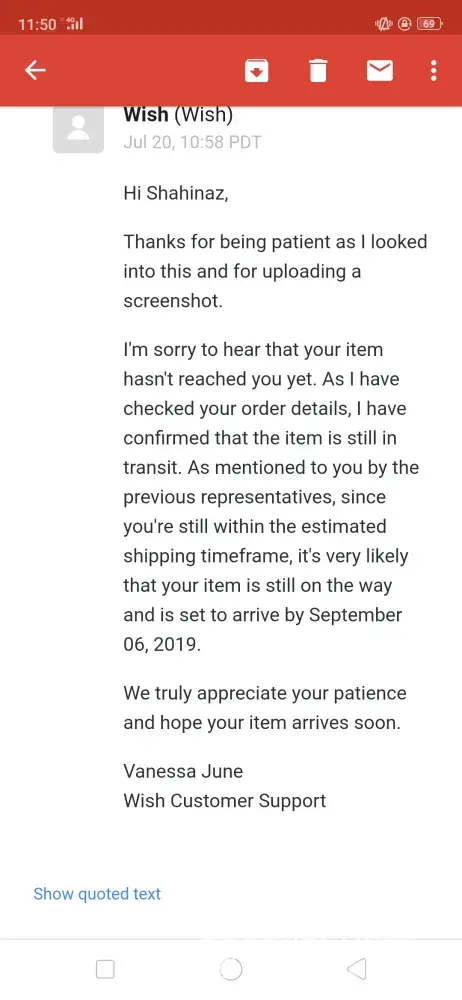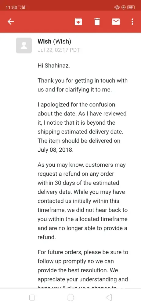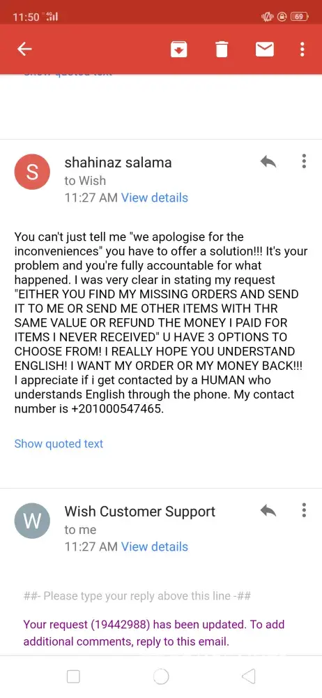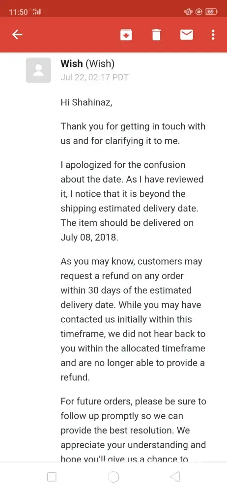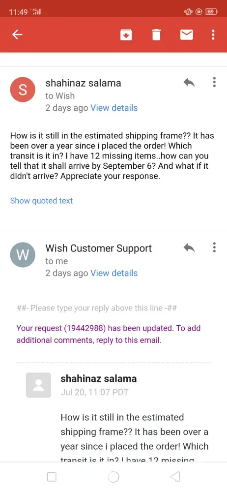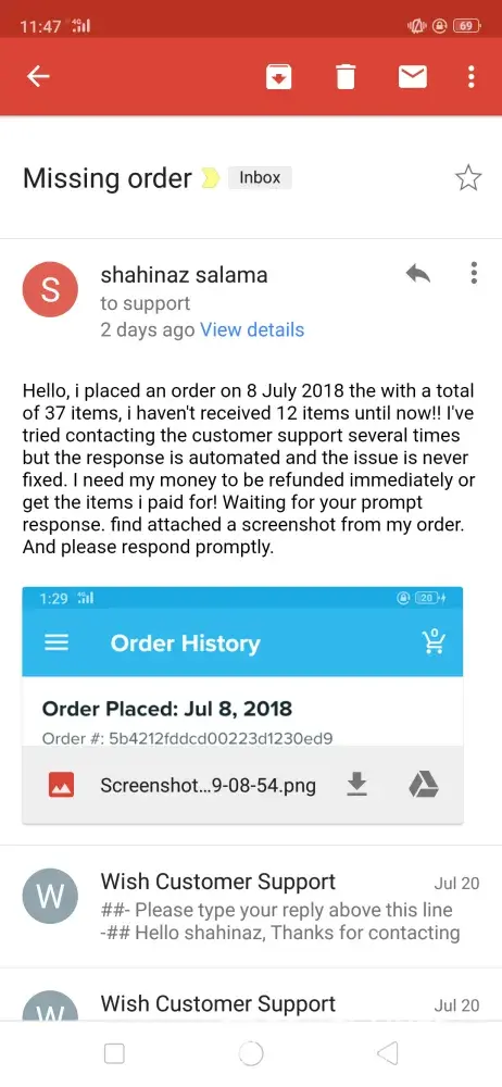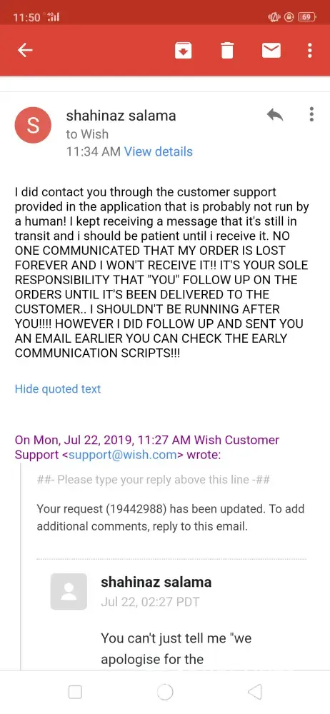 I placed an order on wish.com on 8 July 2018. I haven't received half of the items (12 items) i ordered uptill to date (22 july 2019) I've tried contacting the customer support several times through the application which is totally automated and never replied with a solution I've received a reply that my items are still in transit and i should be patient till it arrives! Now it's over a year and i haven't received any of the missing items yet! I've sent them several emails explaining the case and stating my request that they should send me the items and follow up on their status or if they are lost they should send me other items with the same value or refund the money that i paid for those items i never received! I received dumb replies stating that refund isn't possible after 30 days of delivery! Duhhh i never received them! Please help me find a solution for my issue with this company that apparently intend to steal your money! I've attached screenshots of the email log. Kindly help