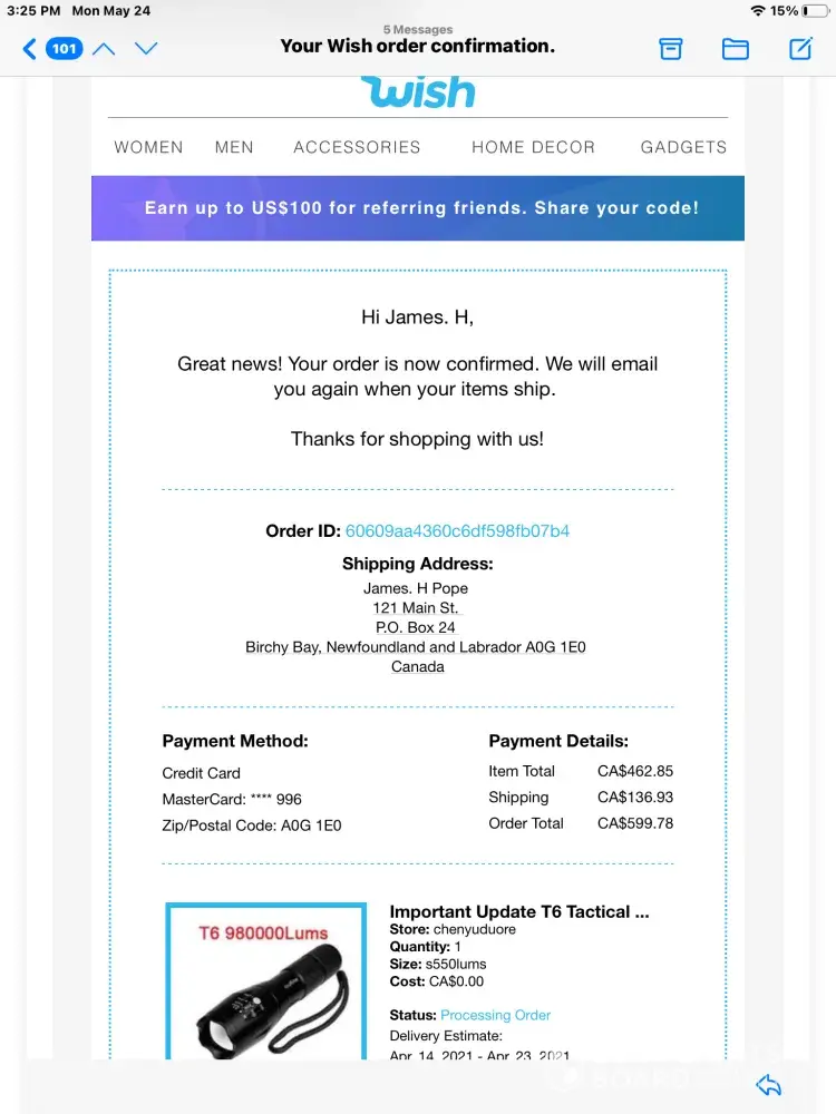 On March 28th 2021 I ordered one item less than five dollars and wish charged me for nineteen items and and charged me$599.00 to my credit card and would not let me cancel it immediately after I received a email with my Order ID but wish would not let me cancel it I tried for hours and days after but they would not let me cancel it all they said I could return it when i receive it. I did not order it and I do not want it .It's been four months now and they will not refund me the money. I am a senior citizen and i do not have that much money, they will not answer my emails any more, I love to get my money back thank you James Poe