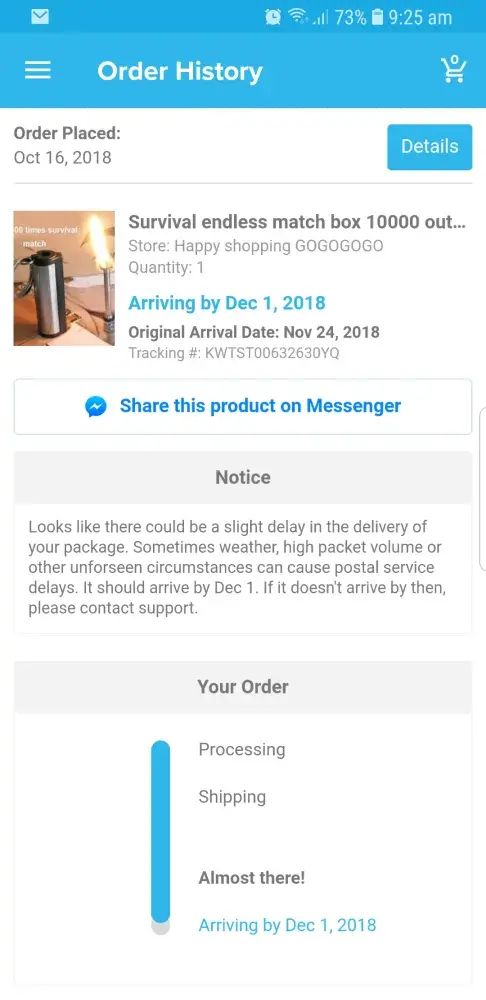 Thank you for choosing wish as your trusted shopping carrier, we want to apologize for the delay on your package I know you’re currently working as fast as possible to have this resolved.