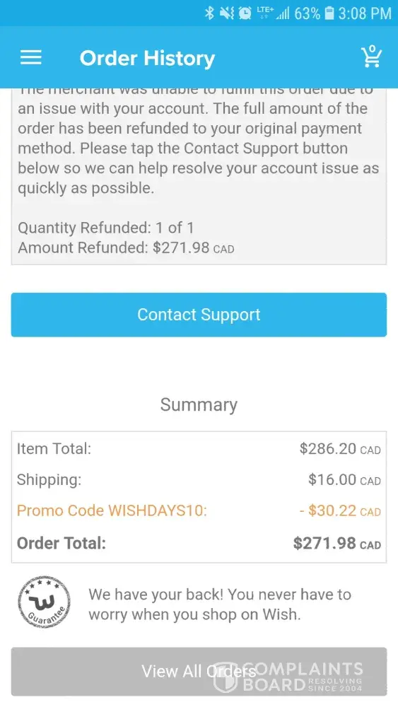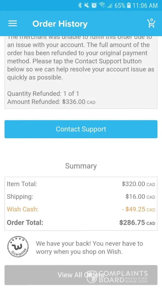 Nov 4th 2018, got 3 notifications of purchases made that were not me. Moments later my account was suspended with 3 purchases totaling over $600. Tried to log on to cancel with no success. Notified wish of the problem and waited 3 days without a response. Notified my credit card company that has been dealing with other complaints regarding wish and told me that wish.com will be issuing an email explaining of some sort of security breach. Later that day 2 of the 3 purchases were refunded but one was not...was refunded as wish cash ie store credit. With my account frozen and numerous attempts to fix with direction from wish support with no success and never an email explaining that happened regarding the so called breach. Now the real fishy part. I've emailed wish support several times and kept getting the same generic response back. Sent screenshots of everything explaining the outstanding wish cash credit showing the credit still on my account with the same response. Tracked down the number and called. The number is unreachable, directing to to contact via email. Tried to login online instead of the app but says it doesn't recognize the email. Just sending me in circles without giving answers on the issue at hand. Now yesterday I look on the app and the wish cash that has been there since the 4th is now gone so someone is keeping tabs on accounts in a very negative way.