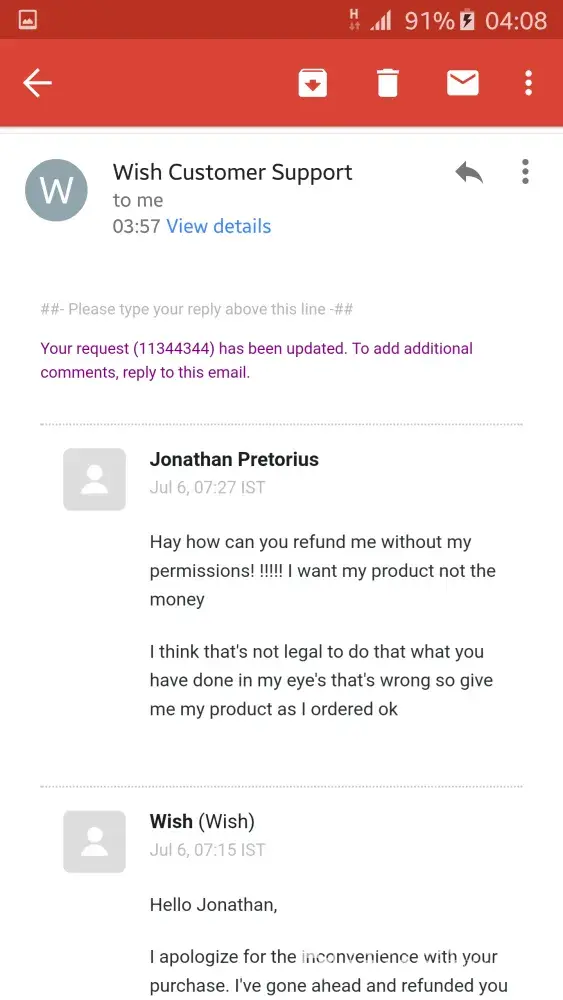 I AM DONE WITH WISH...THEY WILL NEVER GET ANOTHER DIME FROM ME! I AM ALSO DONE WITH ONLINE SHOPPING PERIOD...TOO MUCH PROBLEMS! I THINK THE BETTER BUSINESS BUREAU NEED TO INVESTIGATE THIS COMPANY.