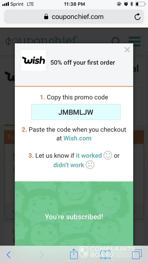 Wish company had an promotion on it's application, that I downloaded to my phone, for personal shopping. This contest encouraged you too log on too your account everyday and on the 7th fay you would receive a stamp for 50% off your next purchase. I did this and received my 50% off stamp. However I went online and purchased a marlyin monroe tapestry, and a marlyin monroe headphones set. My card was charged full price. I went back into my application and checked my promotions, and the stamp read 50%Off my next purchase AFTER! I get a friend too join and theu buy something, THEN, my next purchase is 50%off. B.S. I called my credit card and put in a dispute which could take 90 days to resolve. I tried too cancel my order on the website, however it says someone will respond in 72 hours. We know thats just enough time for the card to approve the purchase so they can call and laugh. The contest was a set up too have people make activity on their website too mislead investors.