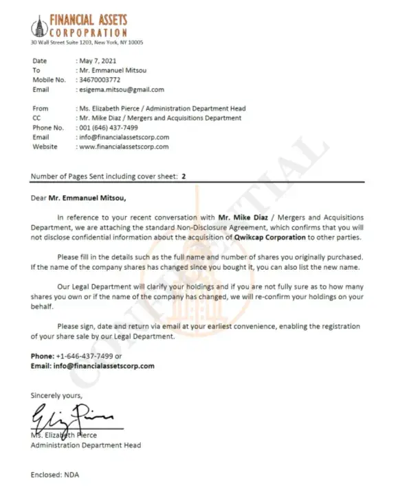 received an NDA from Financial Assets of NY - they contacted me to by my 3, 000 shares of Qwik Cap stock. please see attachment and let me know of your suggestions...