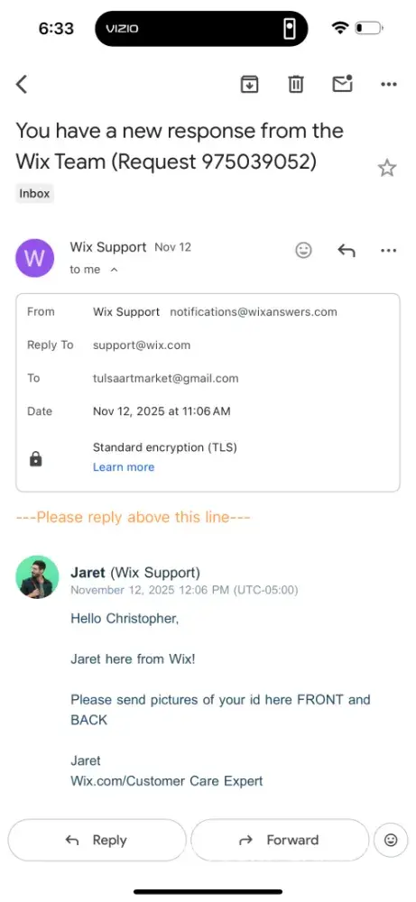 Then, my bank account went into the red for the first time in 40 years because Wix froze my payment. They didn't communicate with me at all, and I felt really embarrassed and frustrated. I tried chatting with them again, and they said they would mark my case as urgent. But later that day, I got an email from 'Justin' at Wix asking for the same information again. I was so angry that I managed to get a telephone call with someone from Wix in America.