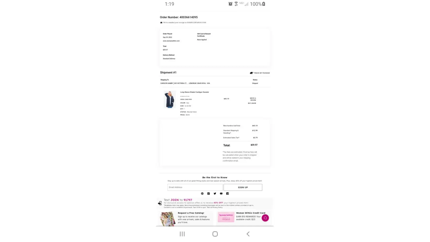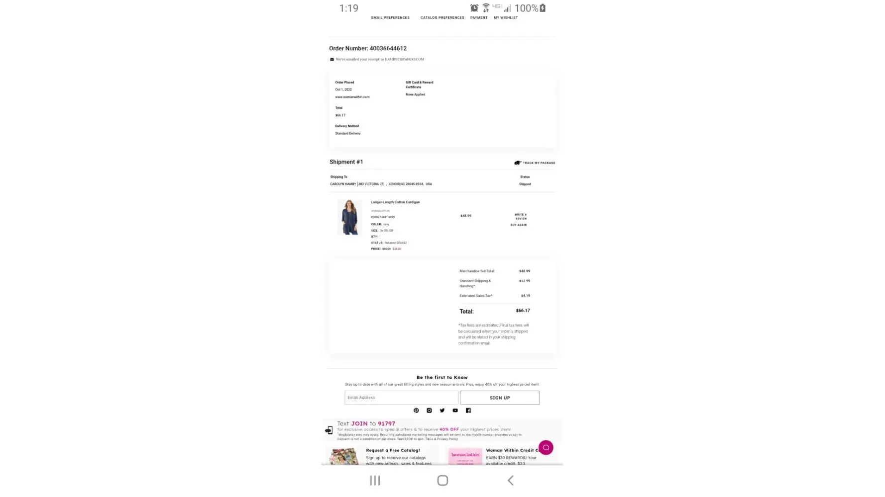 I placed an order on Sept. 27 for a black cardigan sweater, that with shipping was a total cost of about $42-45.00. As it turned out, it was on back order. On Saturday, October 22, I got a postage due form from the post office for a package from the FULLBEAUTY company for $12.25. I was obviously very confused since I had paid an enormous amount for shipping with my order (12.99 to be sent from the east side to the west side of Indianapolis!) so I couldn't imagine why I was being charged again. On Wednesday, I called the customer service line, talked to Shane, who was very helpful, and she could she nothing from her end, so I decided to go get the package from the Post Office, pay the $12.25 and see what was going on from this end. As it turns out, your shipping department, sent my package to my old address (I moved to my present address in March 2022 and have received packages from you at this address since then) and the Post Office then forwarded my package to my present address and slapped on a fee of $12.25. I again called and spoke to another customer representative, who informed me that I could not get a refund even though it is clearly your error. Why would I pay over $25.00 shipping for a sweater? You really need to make this situation right and refund my $12.25. I have since returned the sweater. I just couldn't keep it and every time I would wear it I would just be angry.