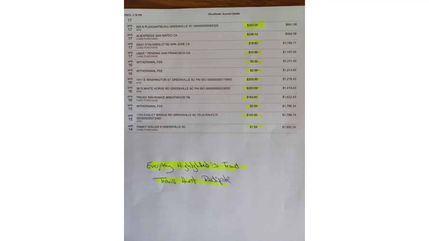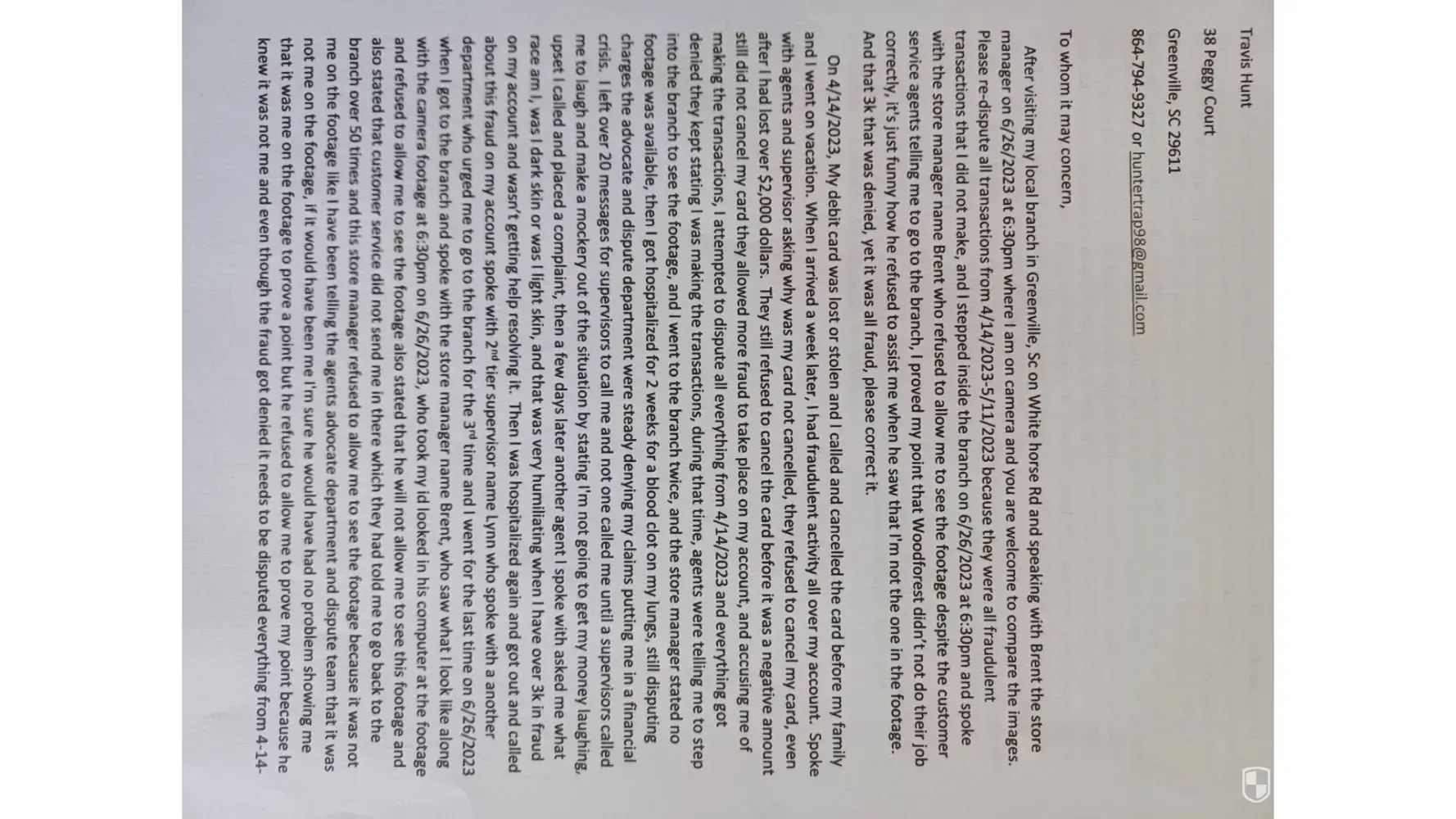 -0 Fraudulent transactions took place on my account from 4/23-5/23, 3k worth of fraud every dispute and claim was denied, then told to step into the branch to see the footage to prove it was not me on 6/26/23 then told I would be refunded quickly after I proved it was not me. Brent the branch manager on white horse rd in Greenville, SC took my id and acknowledged it was not me on the footage refused to show me the footage, ask me to leave, and tells me I had no business in there, came home expecting to receive money owed to me from the fraud since they now have footage of me knew they would compare the footage against the person who actually done the fraud, was told to re-dispute it by supervisors. They blocked me from calling on 2 numbers, and hang up on me stating they will not assist me each time I call they tell me I need to step into the branch, and after telling me I need to step into a branch they refused to assist me 3 times, I proved it was not me. They have refused to honor their end of the bargain they have actually, shown this bank is not an honorable bank for falsely accusing me then they never refund my money after proving that was not me whom they accused of fraud, next they block 2 of my numbers from calling, then they flag agents to hang up on me whenever I call then they tell me to go back inside a branch that refuses to assist me as if they are trying to send me on a suicide mission to get assassinated, attempting to send me inside to branch for the 4th time after they have refused to assist me, making me out to be the bad guy when Woodforest are the bad guys, from the agents hanging up on me, not refunding all the fraud in my account then sending me on a dummy mission to get assassinated which the media would say the worst but in reality, its Woodforest will treat a customer like friends as money deposited but as money is withdrawn or if fraud is on their account you are their enemy, and they will treat you like a enemy don't choose this bank