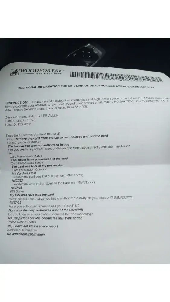 Onb January 1, 2009, I recieved a call from Woodforest in Texas, stating that as the person in question was by my side when I entered the pin, this was not an identity theft. I asked if they had recieved the information that they had requested and was told that she had just recieved it and was reviewing it and would call me back.