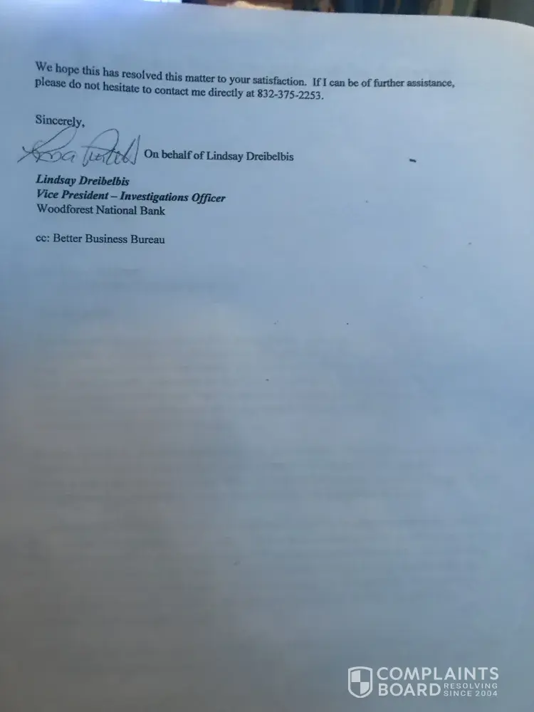 I am waiting for response and received one yesterday b/c of the complaint I submitted. I am waiting to have ALL of my NSF reimbursed because of lack of follow up by the local branch and no responses to my messages. It takes one -two week for Woodforest to respond to messages. I appreciate the contact person calling me yesterday and will wait to see if it is resolved and NSF reimbursed which would also mean that my check for 81 that was rejected twice and others would have been sufficient and funds to covered had they listened and followed my request at the local branch as well as in my messages. Thank you.