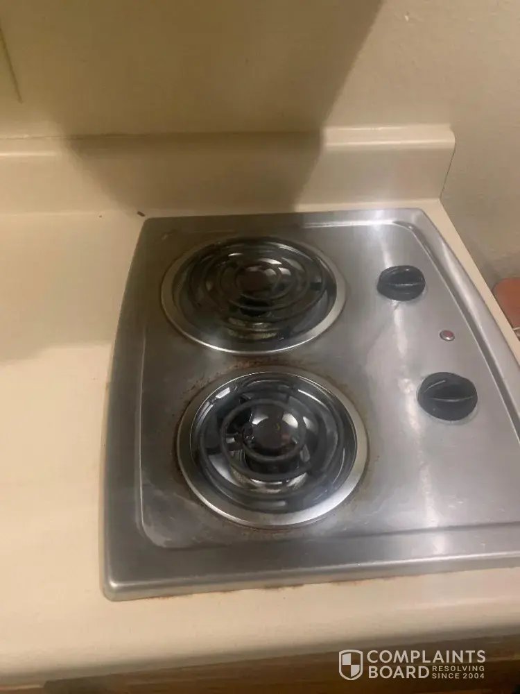 Checked room out and found stove top was rusty and had burned food particles around burners. Reported this to management but since I was not going to cook in the room I took the room. Stayed one night killed three bugs, pillows were little more than half filled sacks with some kind of stuffing. Would not even call them pillows. Checked out a day early because wasn't going to stay in bug infested room for one more night. Knew I would be charged for two night stay but was willing to accept it. Paid cash for room and left. Now I find that I am being charged on my credit card an amount that is equal to half of what I was charged to reserve the room. Room reservation charge still not refunded on my credit card three days after I checked out. Called credit card company to dispute the extra charge. Not going to pay to clean a room that was dirty when I checked in. When I did check in desk clerk made a copy of both sides of my credit card. Felt this was unnecessary since the information was used when I made the reservation. Now I see they need the information to make fraudulent charges on it. WoodSprings advertises the cleanliness of their rooms. They didn't mean this one. The attached pictures were taken when I checked out the room and reported it to the desk clerk,
