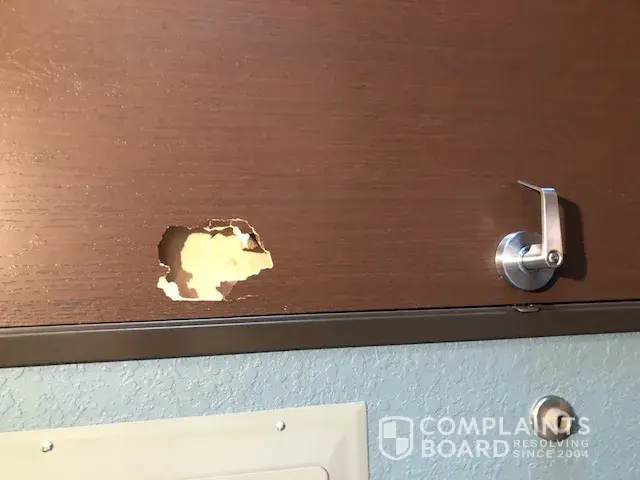 Also, I am attaching a picture of a large hole in the bathroom door upon entering. This was not due to me but rather a prior customer with possible rage issues. I would of changed rooms but nothing was available and it was on the 4th floor. We didn't want to wait/switch rooms w/limited time and a crying baby.