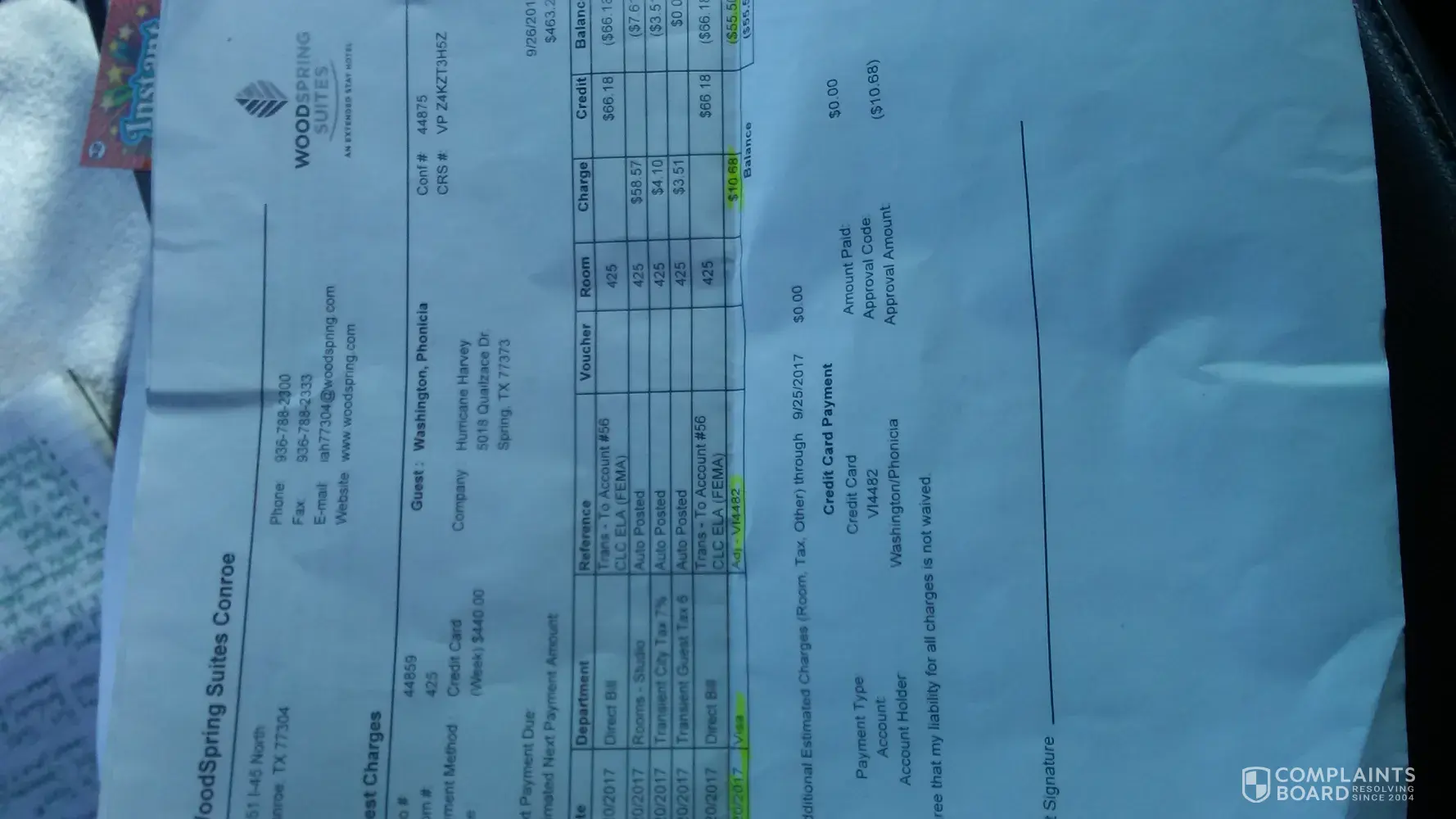 9/19/2017 Due to Hurricane Harvey I was displaced and had to find a hotel to stay recommended by FEMA. I decide to stay at Woodspring suites in Conroe. I have allergy asthma and I requested a non-smoking room. John never told me that there are NO non Smoking rooms left! (which would have been helpful and I would have booked elsewhere). The guy at the front desk was John, was racist and was very disrespectful to me to point I had to call the police after I requested to check out due to they only have smoking room and my health was in danger. He told me that he WILL NOT check me out of the FEMA system for 1 week after telling him he cant do that b/c I spoke with FEMA. Finally, he said the next day he will, I wasn't able to stay in that smoking room and left to go to another hotel but had to pay their room rate at $120.00 due to John not taking me out of the FEMA system. He said that he will be refunding my 10.56 for lien fees b.c I only stayed for 1 night and handed my some BS receipt stated that I got my refund. But John really charged me and I would like my monies back plus $120.00. I am not going to go in too much detail about the nasty things that was said to me before the police showed up. But overall it was a very embarrassing and stressful situation dealing with John and staff. He told me that I couldn't leave b/c nobody is there to clean the room I was staying in. But, when I went back to floor 4 notice a cleaning staff, so I took a picture. I have so much more to say, I also record everything that was said to me.