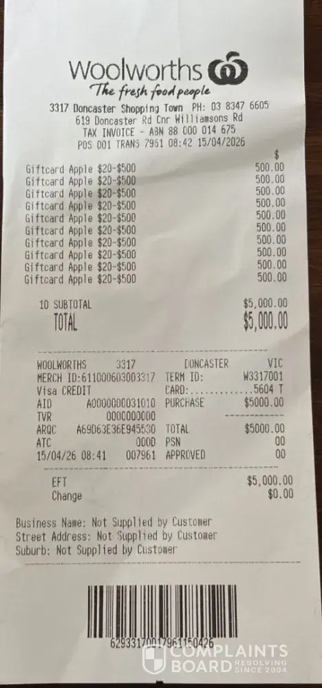 Hi, I would like to formally request a reassessment of my recent purchase at Woolworths Doncaster this morning. I purchased $5,000 worth of Apple gift cards during the 20x Rewards points promotion at the checkout counter. During the transaction, the staff member did not ask for or prompt me to scan my Rewards card and proceeded directly to payment. As thi...