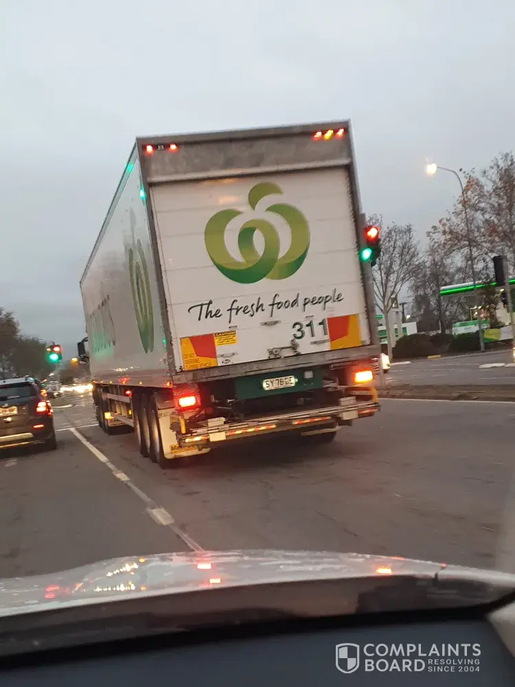 Adelaide, South Australia - Woolworths Truck 311 license registration (SY7BGB) traveling South on South Road, Torrensville travelled in Right lane of for over 10km without overtaking on the North-South Motorway then approx 7:10am 19/07/2021 proceeded to run a red light at the intersection of South road and Ashwin parade, Torrensville. The driver in question had plenty of time to stop without causing a potential hazard. Absolutely terrible representation of the Woolworths brand.