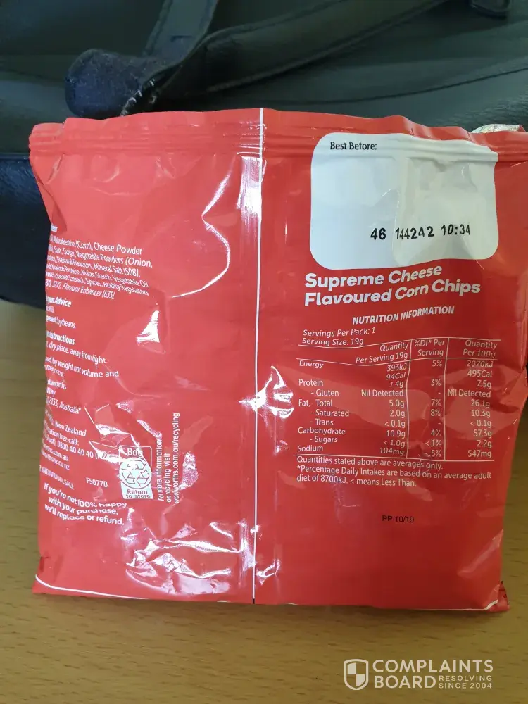 I opened the bag today 16/12/2019 as my kids wanted to have some chips. both of my youngsters wanted the supreme corn chips, I opened 1 packet there was corn chips, opened the next pack no chips whatsoever, only a big pile of flavouring.