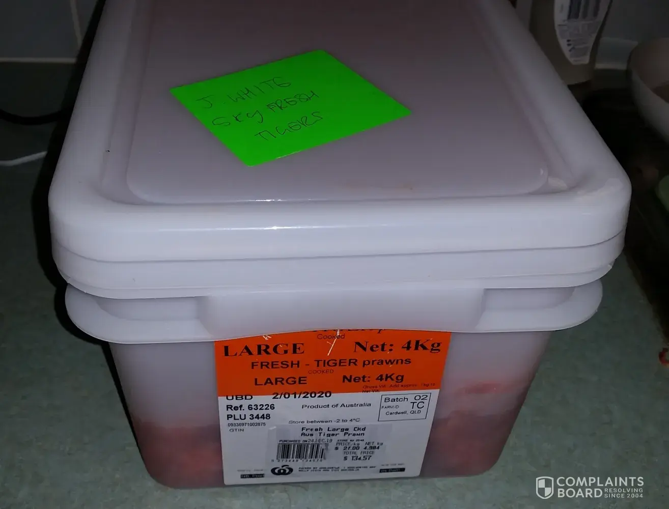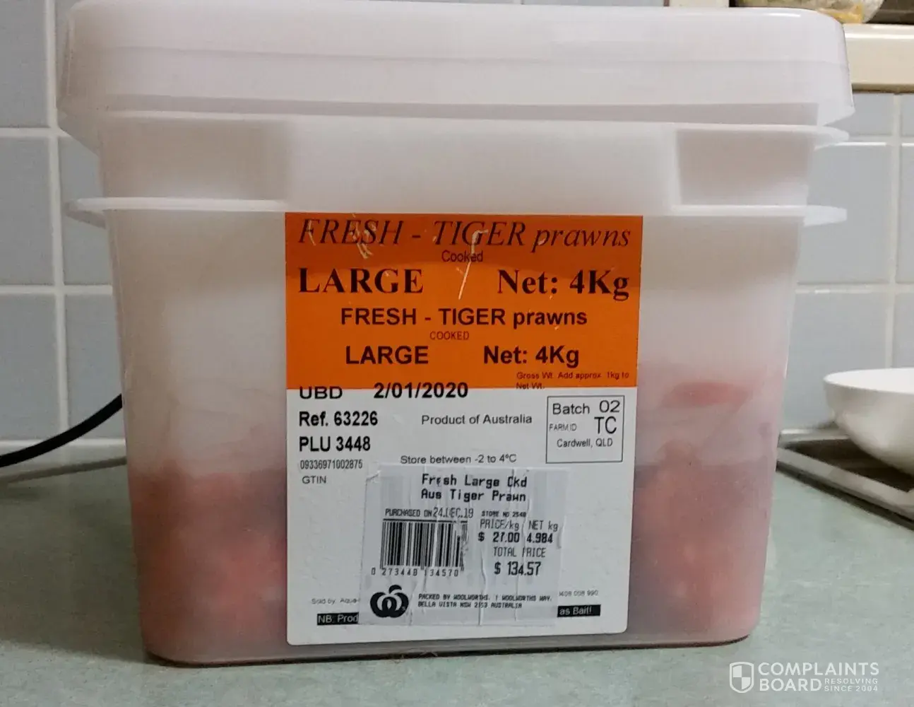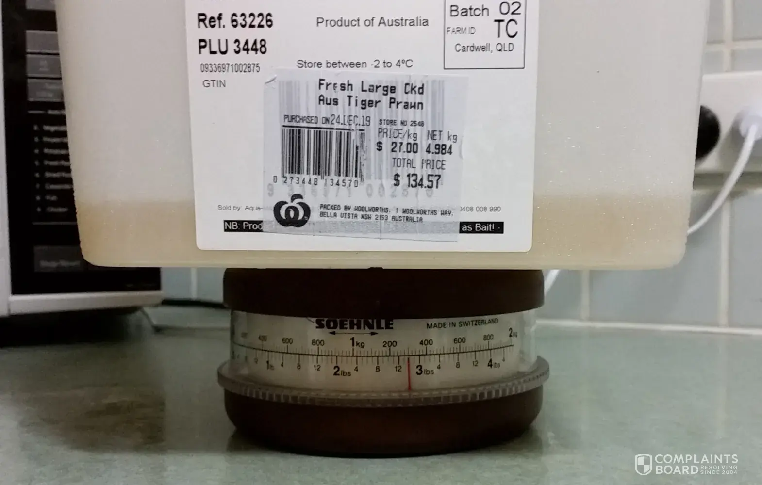 3. The next complaint relates to what we received in weight measure with the plastic tub. The supplier's label shows a net weight of 4 Kg of prawns. However, by the Woolworths bar coded price sticker we have been charged for 4.98 Kg of prawns. After removing the prawns for peeling, we weighed the tub and what was left in the tub, which was an amount of water. That weighed 1.3 Kg. Essentially, we only received 3.68 Kg of prawns from the plastic tub. Photos Pic 4 and Pic 5 attached.