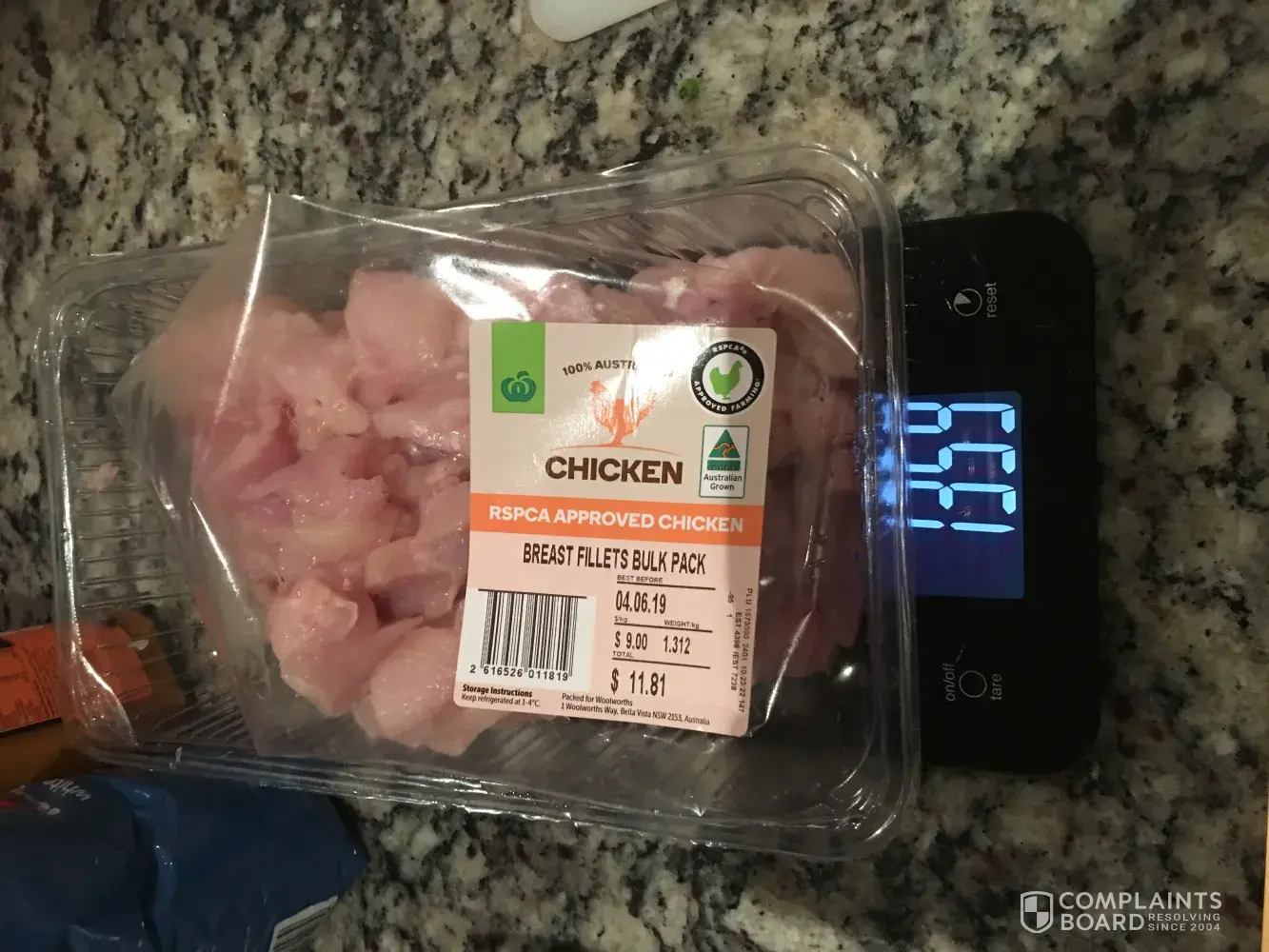 I bought pre packed chicken breasts on 30/05/2019 and on opening thought the breasts were very small and looked lighter than the actual weight of the breast fillets indicated on the label. So I weighed the chicken on digital scales and it was way under the proposed weight. Then I weighed the entire contents plus the packaging and internal contents including the chicken and moisture bag and found that the weight was incredibly close to the advertised weight of supposedly chicken only. I'm very dissatisfied with Woolworths Glenelg south Australia and wish to take this further.