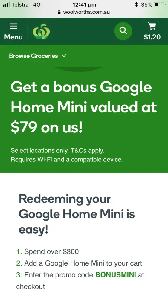 I have placed my first Online order with Woolworths which is due to be delivered this afternoon. I am just a bit disappointed that on the website it says that a free Google Mini can be received with orders over $300 which mine is. When I tried to add this to my order it says that they are temporary unavailable and I could not add to my order. I believe this is false advertising. It should also least offer a rain check on the item. I tried to talk I someone on your live chat but hat was hopeless and he just argued with everything I had said and didn't seem to be listening to me at all.