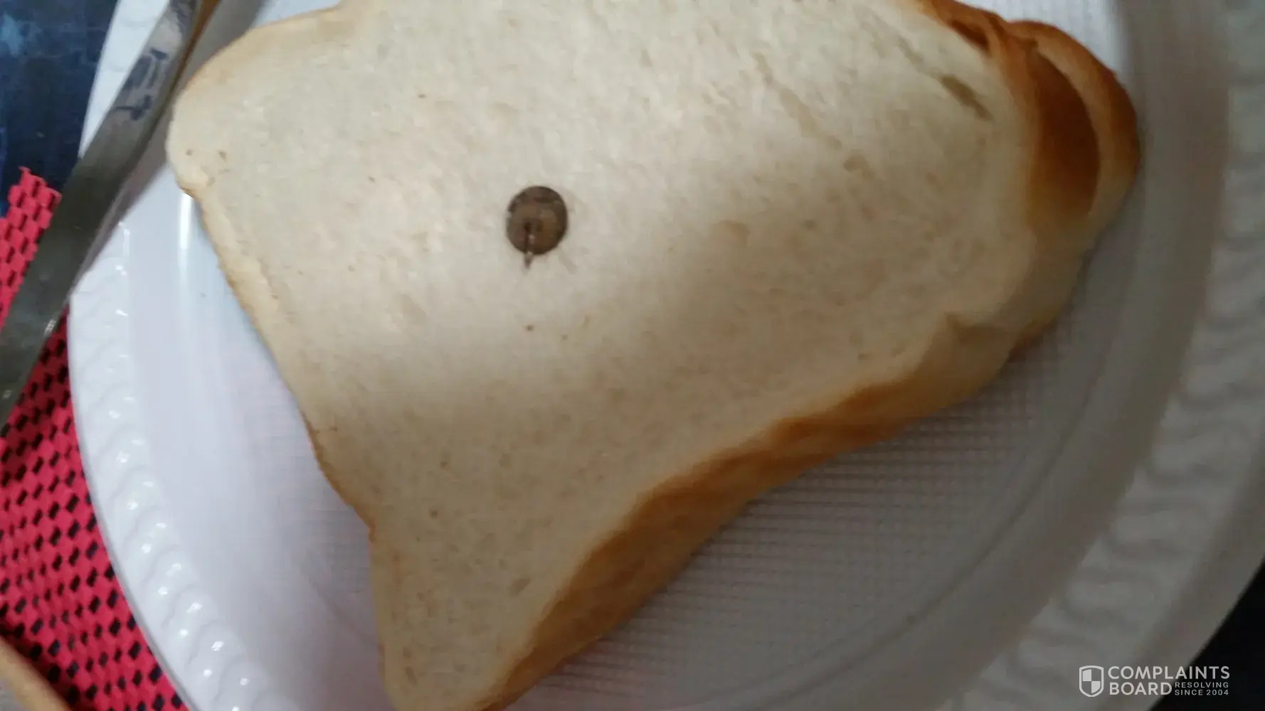 Bought a white sluced vrwad yesterday had 4 sluces out of it tgen tonight i took anotger 2 slices out proceed to lay oth alices on a plate to butter them and to my suprise i see something when i look closer and touch it i life up a rusty thumb tack. I will be going higher with this very bad finding and i would like to be conpansaited as im avery loyal customer of which i shop mostly daily as i do not have a fridge and i do use my reward card wach shop.kind regards very upset customer...