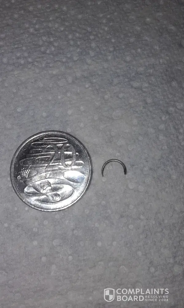Please see attached photo of a metal object (possibly from a butchers glove) that was found on my T-Bone steak that was purchased from Woolworths in Jordan Springs.