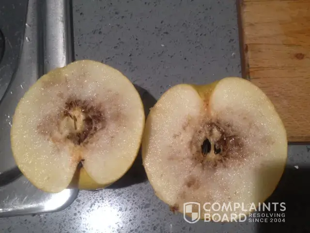 Yesterday (3.7.2018) I purchased from Woolworths in Queanbeyan NSW a new fruit item called PAPPLES (apparently a cross between a pear and an apple). They were $5.00 per kg so, not cheap. But to try them I purchased 4 of these papples which came to $3.86. Not a great deal money wise, but when you are a pensioner every cent counts. On arriving home (a 2 hour trip to where we live on a rural property), I decided to make some fruit salad for dessert and thought I might add some of the papples to see how they tasted. Well, on cutting into two of them, they were rotten inside - not impressed to say the least. I am attaching a photo so that you can see what I mean. Anyway, as I usually only visit ''town'' once a fortnight and I didn't want to keep these bad papples until I returned to Woolies in Queanbeyan to put in a complaint, I decided to do it online. Looking forward to your reply. Regards Gabby Frizzell, email address: [protected]@yahoo.com.au