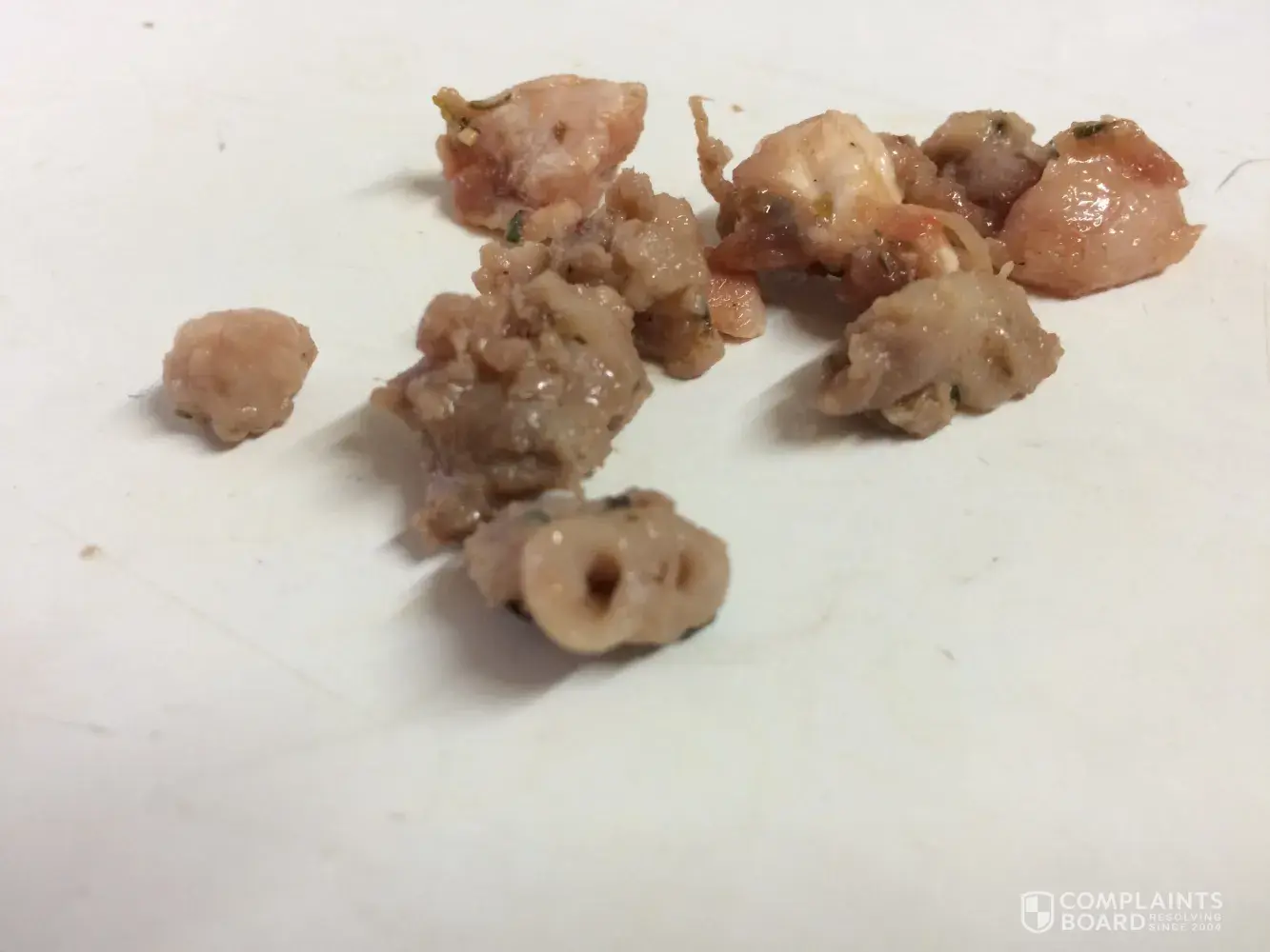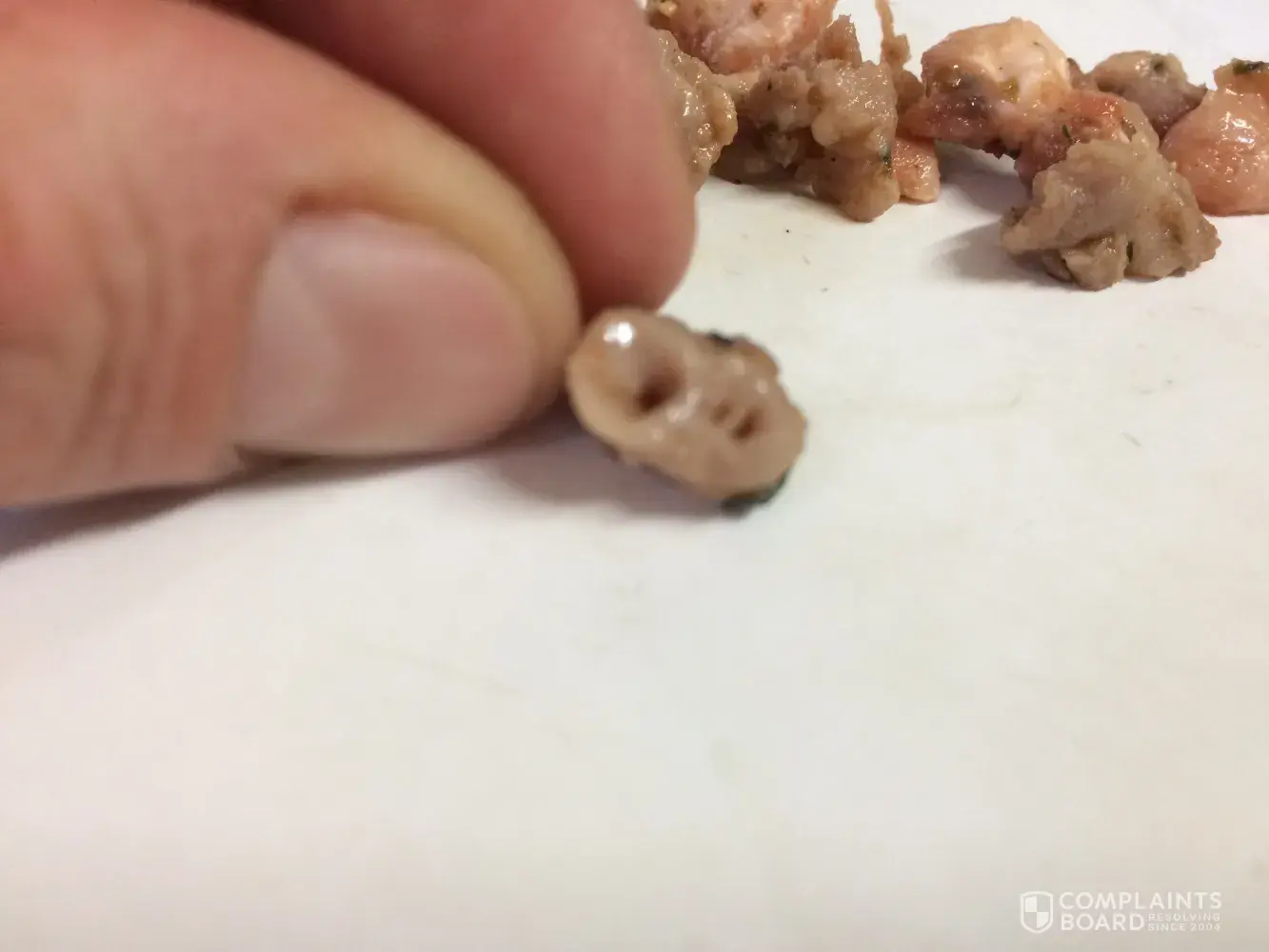 I have provided photos of the sausage that I cooked last night. The pile is just some of the hard grizzly bits I took out when breaking them up for a dish I was making. Who knows what the other tubular piece of organ matter is..! I had already thrown other bits out before I decided to ‘collect' and photograph them. My daughter also got more bits when she ate the actual meal. I cannot believe this is considered acceptable for human consumption. Maybe for dog food! Can you get back to me pls and let me know whether you consider this an acceptable standard of food for human consumption.
