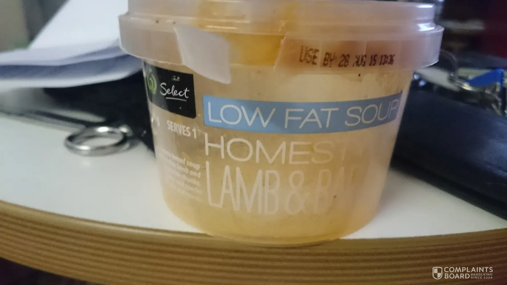 On Wednesday 19/08/2015 I had for lunch a small tub of Woolworths home brand Low Fat Soup Home Style Lamb & Barley the expiry date was to the 28th August 2015.
